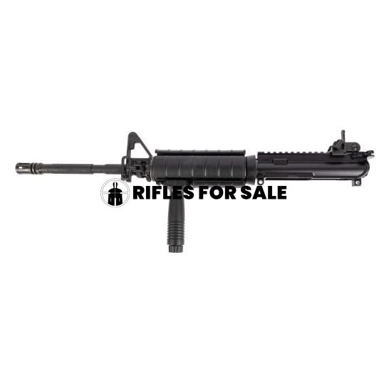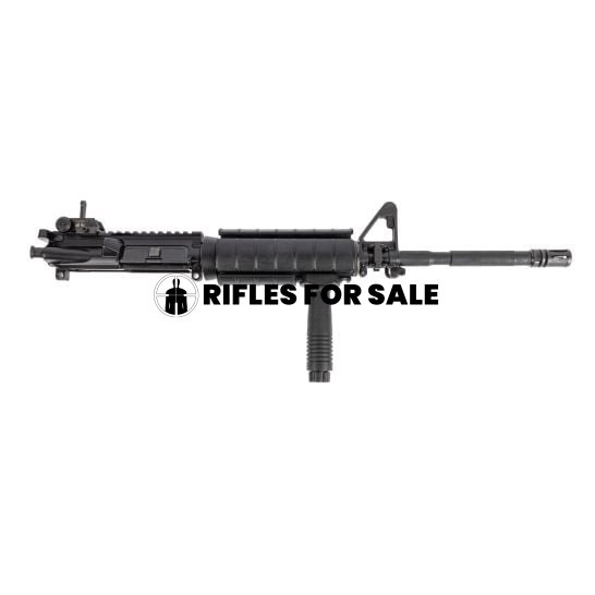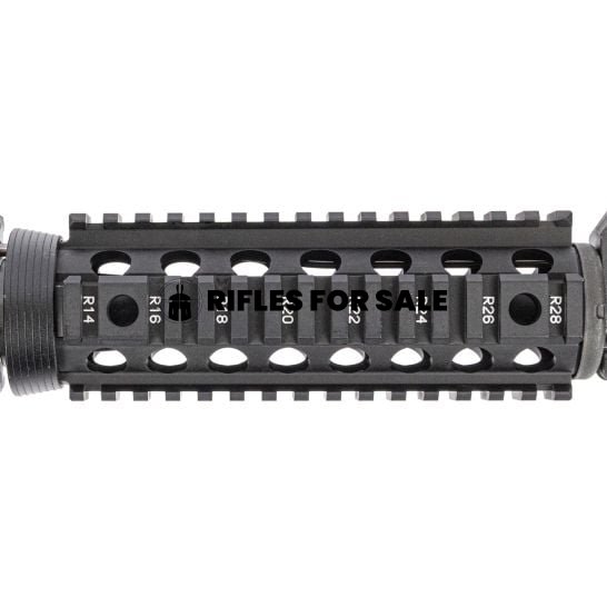 Barrel: 16″ M4 profile barrel chambered in 5.56 NATO with a 1/7 twist, M4 barrel extension, and a carbine-length gas system. Barrel is finished off with an F-marked front sight post with side sling swivel, quad rail handguard with vertical grip and rail covers, and an A2 flash hider.