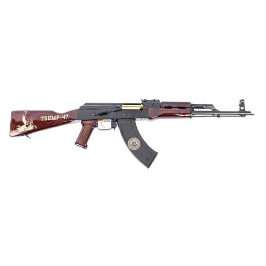 The barrel is a proprietary blend of hammer-forged chrome-moly vanadium made by FN that is referred to as “Machine Gun Steel” by virtue of its use in FN’s M249 and M240 weapons. The hammer forging process work hardens the steel, making it more durable. This 16″ barrel is magnetic particle inspected, to ensure quality and dependability and is pressed into a hammer forged 4340 AQ front trunnion to ensure the longevity AK-47’s are known for. The hardened steel 1mm receiver features a TiN-coated PSA EPT Fire Control Group and a side rail mount. The carrier is hammer forged and TiN coated. The front trunnion is engraved with GF5 to designate the new GF5 hammer-forged model. The rifle is finished with a classic Plum Gloss handguard, “Trump-47” engraved stock, and grip. This rifle ships with a 30 round magazine with engraved Seal of the President of the United States (where allowed by law).